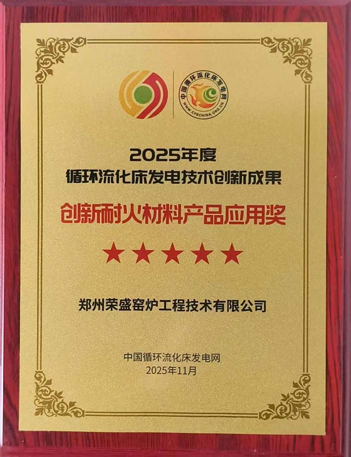 在本次大會上,鄭州榮盛窯爐工程技術有限公司憑借其在耐火材料產品研發與應用方面的良好表現,榮獲2025年度循環流化床發電技術創新成果“創新耐火材料產品應用獎”。該獎項是對公司在循環流化床鍋爐耐火材料領域持續創新、技術突破與產業化應用成果的權威認可。
