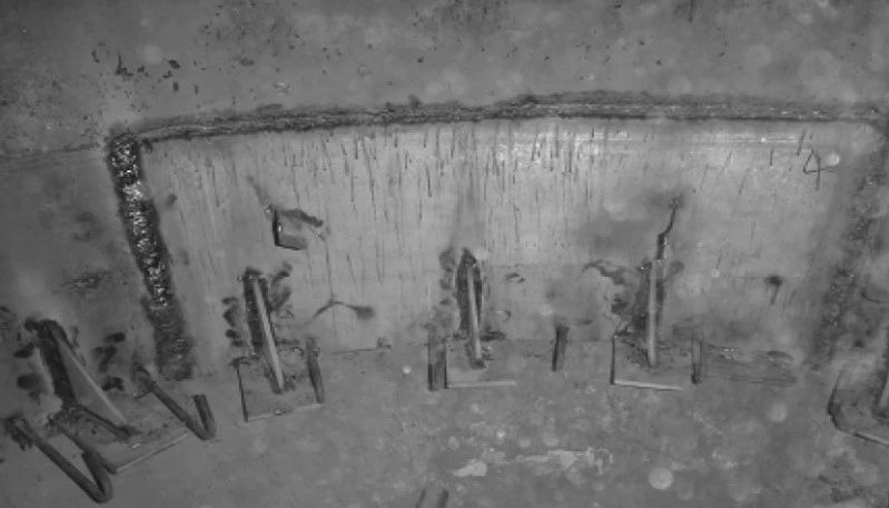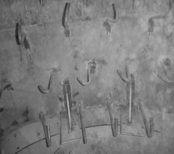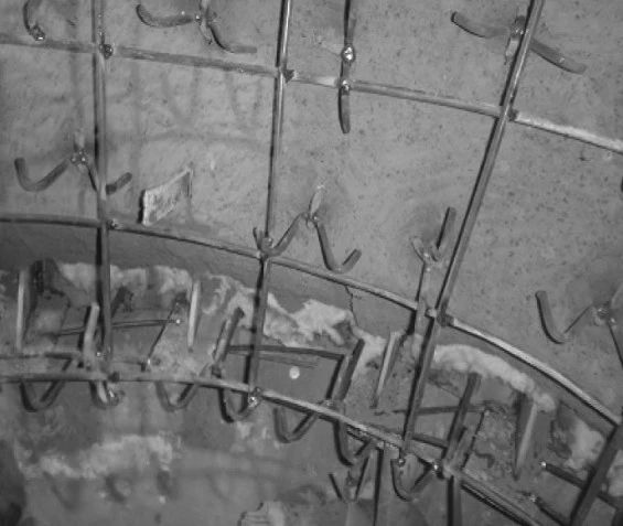 (4)原錨固件為Y銷釘,每隔150mm交錯(cuò)布置,銷釘端部沒(méi)有鋼筋網(wǎng)格,使耐火材料無(wú)法形成整體,個(gè)別銷釘失效后會(huì)使局部耐火材料松動(dòng),相鄰耐火材料之間沒(méi)有可靠聯(lián)系,zui終脫落。