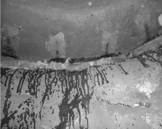 3、耐磨可塑料施工。可塑料敷設(shè)在施工構(gòu)件上后,用木錘或橡皮錘搗打密實(shí)。塊與塊之間的接縫也應(yīng)搗打密實(shí),使接縫嚴(yán)密,將表面壓光、壓平。所施工部位與原來(lái)墻體接縫處應(yīng)確保平滑過(guò)渡,不得凹進(jìn)或凸出。用磷酸鋁溶液浸泡硅酸鋁纖維板封堵膨脹縫,避免鍋爐運(yùn)行過(guò)程中出現(xiàn)竄風(fēng)現(xiàn)象,導(dǎo)致非金屬補(bǔ)償器燒損。耐磨可塑料施工完畢后的膨脹縫封堵如圖4所示。